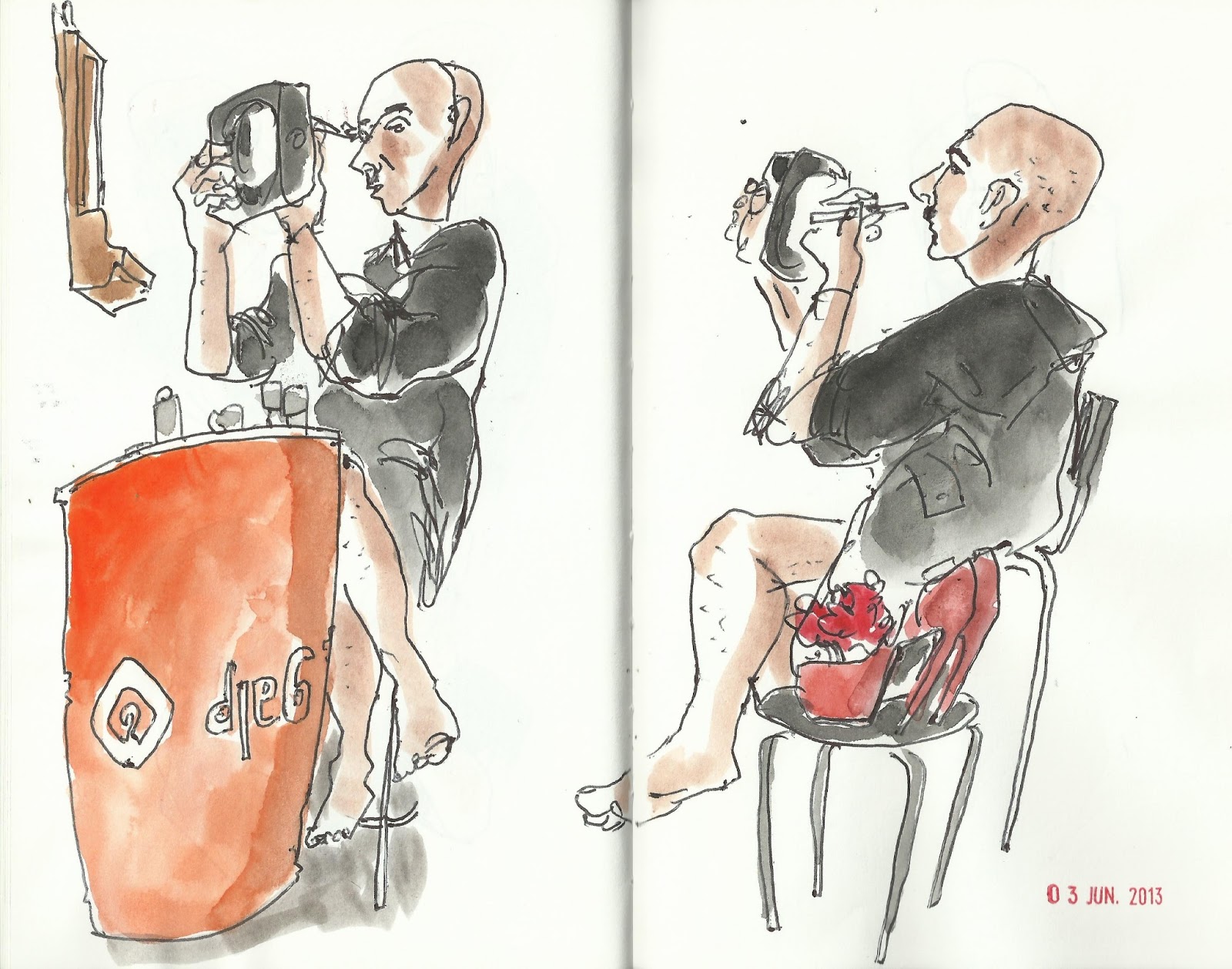 A segunda parte da sessão de hoje do desenho Cru trouxe-nos uma extraordinária performance do Pedro Miguel Silva, maquilhador profissional, que no final se revelou como Morgana. O registo desta primeira segunda feira de cada mês mantêm-se, surpresa nas performances, e o ambiente "cosy" do costume. Que maravilha.